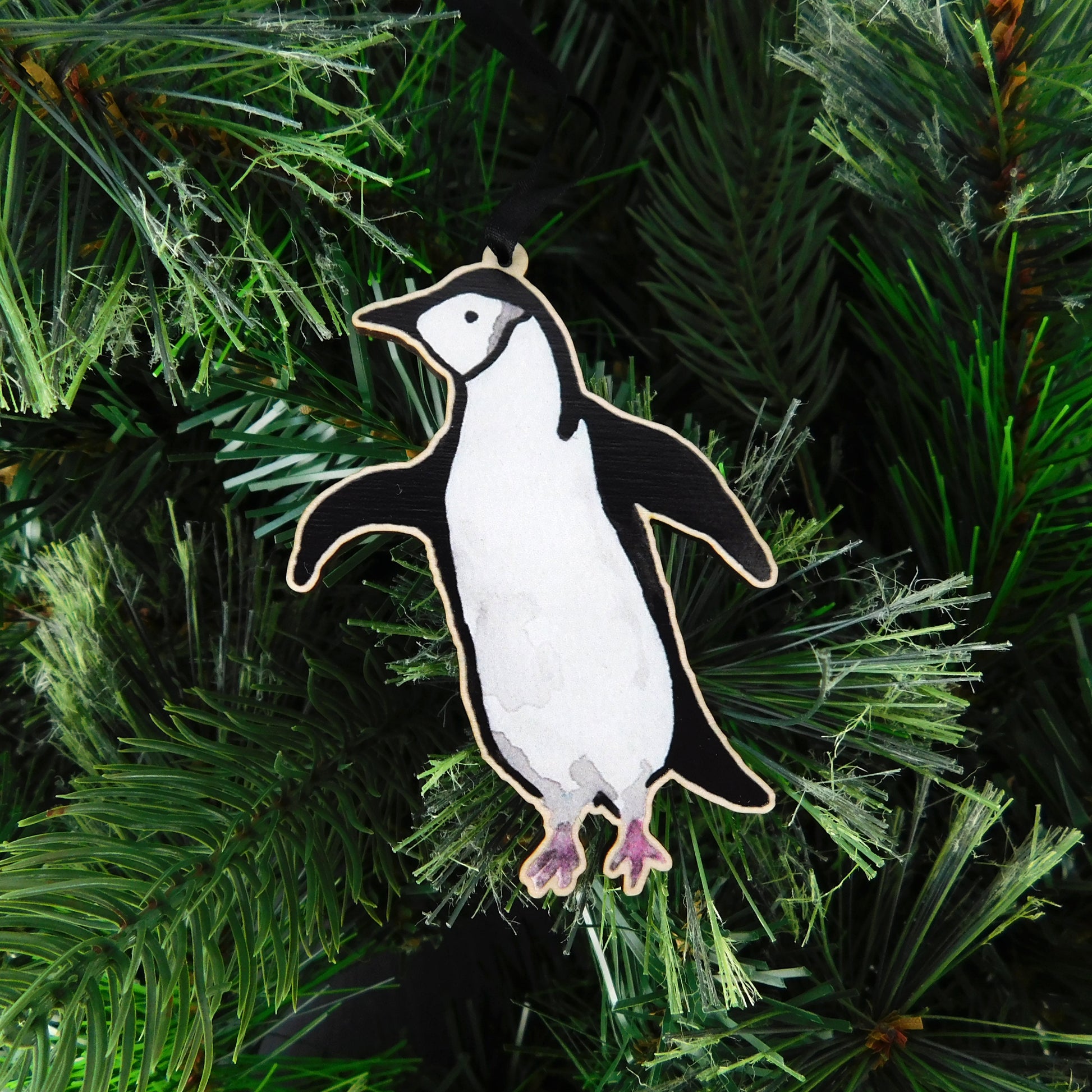 This penguin has been hand painted in watercolour before being digitally printed in the UK onto 3mm laser cut birch wood and strung on a satin ribbon. It’s a miniature work of art, perfect for hanging on Christmas trees, use it to finish an extra special present, or for decorating the house all year round!